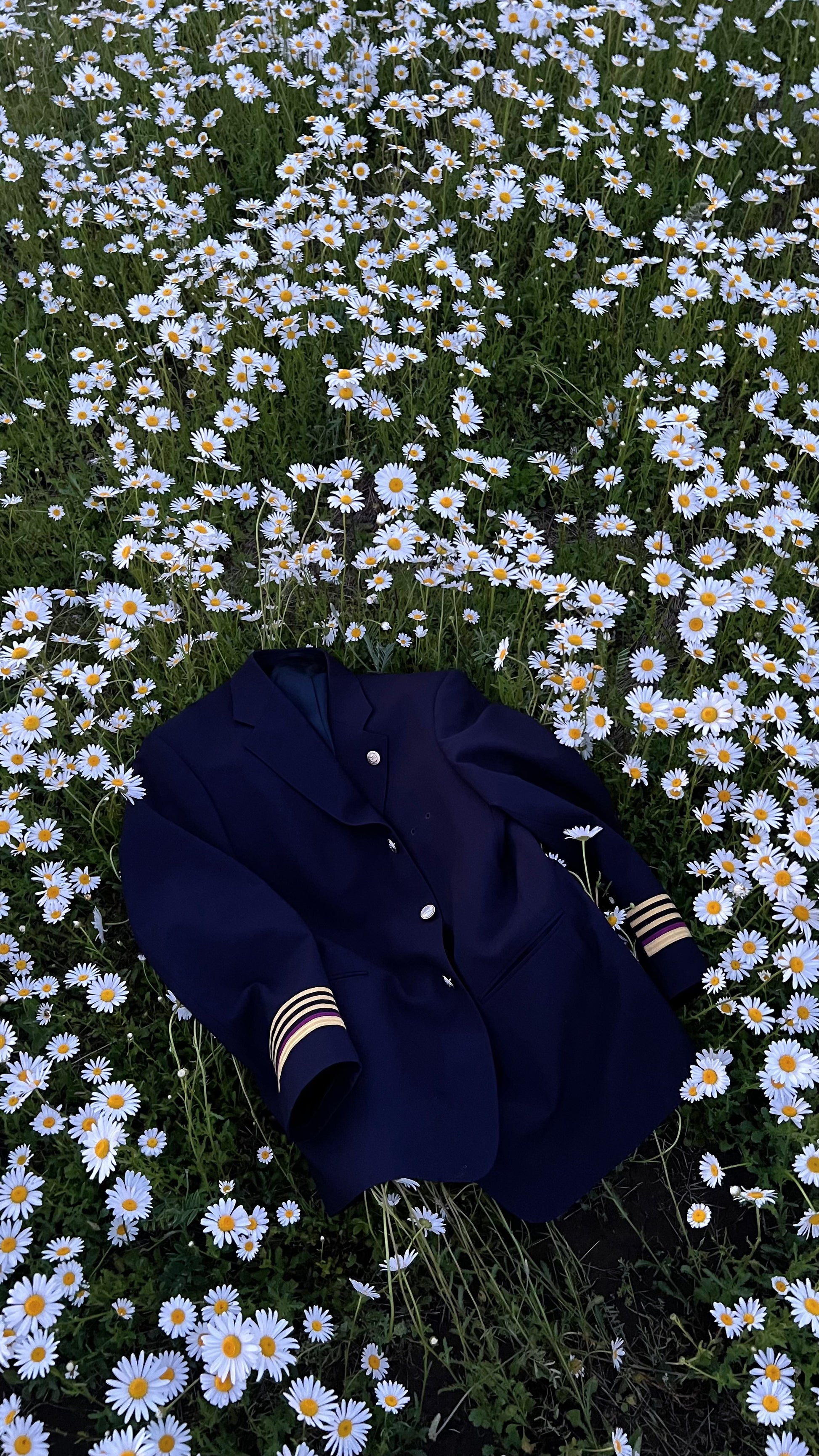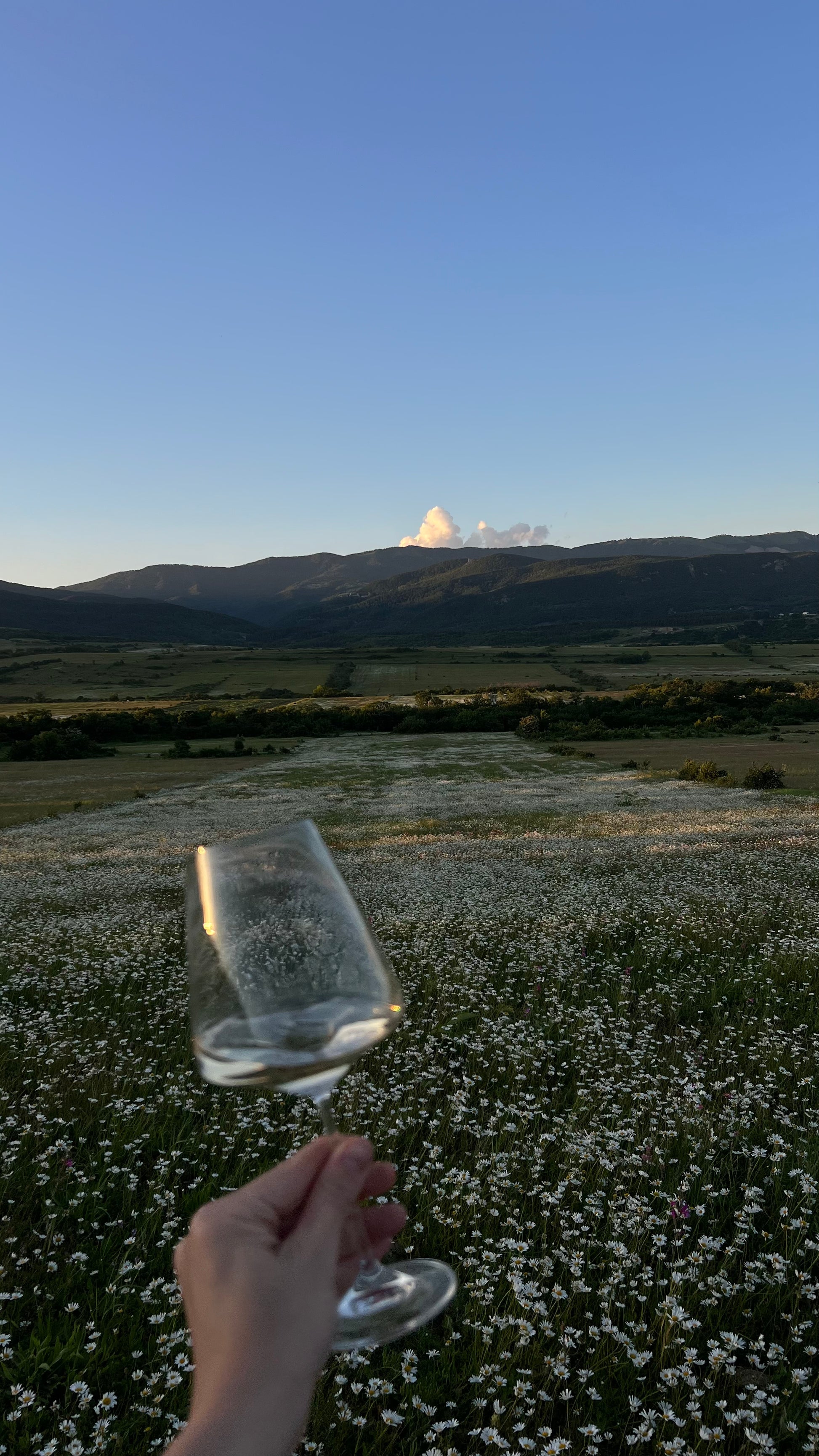 An evening trip to a peaceful meadow of giant daisies with a mountain view.